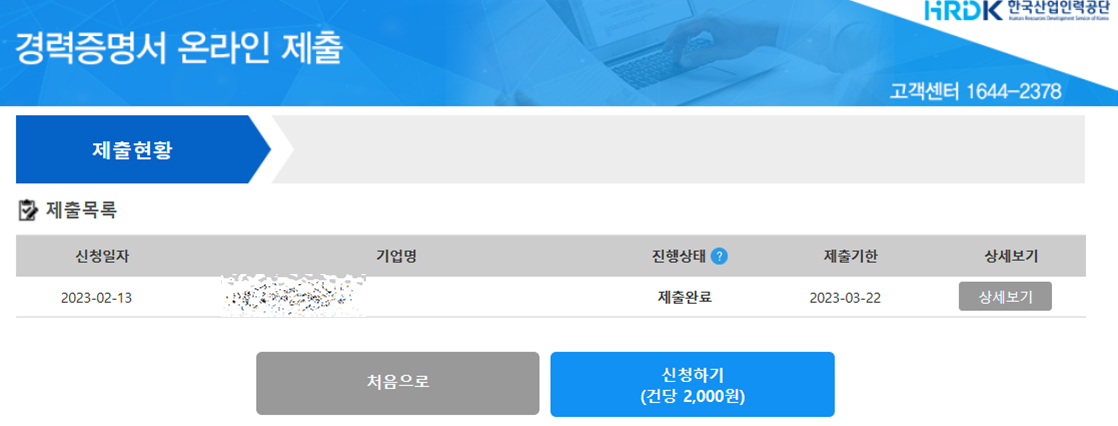 이거는 온라인으로 경력증명서를 제출했던 분들에게 해당되는 부분이다. 제출현황 - 상세보기를 누르면 내가 온라인으로 경력증명서를 제출할 때 입력했던 정보들이 나온다. 기업담당자가 제출을 해주면 '제출된 증명서 보기'라는 파란색 버튼이 생긴다. 이걸 누르면 기업담당자가 입력해준 경력증명서를 볼 수 있다. 개인정보가 담긴 서류라 컴퓨터 캡처는 불가능해서 사진을 찍었다.