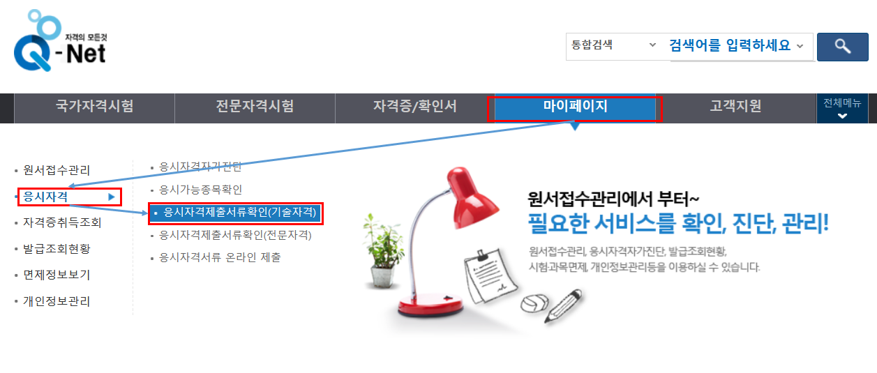 1) 마이페이지 - 응시자격 - 응시자격제출서류확인(기술자격)