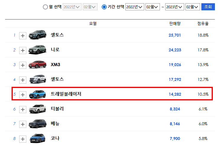 이상으로 쉐보레 트레일블레이저 페이스리프트 자동차세를 알아보았습니다. 쉐보레의 소형 SUV인 쉐보레 트랙스 풀체인지도 23년 출시예정입니다. 같은 쉐보레에다가 같은 소형 SUV라 포지션이 겹칩니다. 오히려 소비자의 선택권이 넓어져 판매량에 좋은 영향을 줄 수도 있지만 소형 SUV를 2대나 출시하면 생산 비용이 커지지 않을까 싶습니다. 쉐보레 트레일블레이저는 국내 소형 SUV 점유율 10%로 쉐보레 치고는 엄청난 판매량을 보여주고 있습니다. 쉐보레의 효자 품목입니다. 케이카에서 중고차로도 괜찮은 가격에 판매하고 있습니다. 이번 페이스리프트로 트레일블레이저 판매량이 더 개선될지는 두고 봐야겠습니다. 감사합니다.