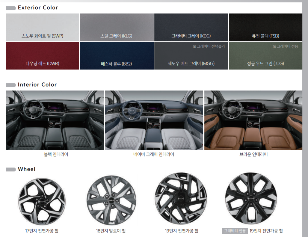외장 및 내장 컬러와 타이어 휠 디자인 목록이다.