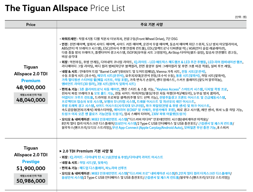 | 폭스바겐 티구안 올스페이스 2.0 디젤 가격 |