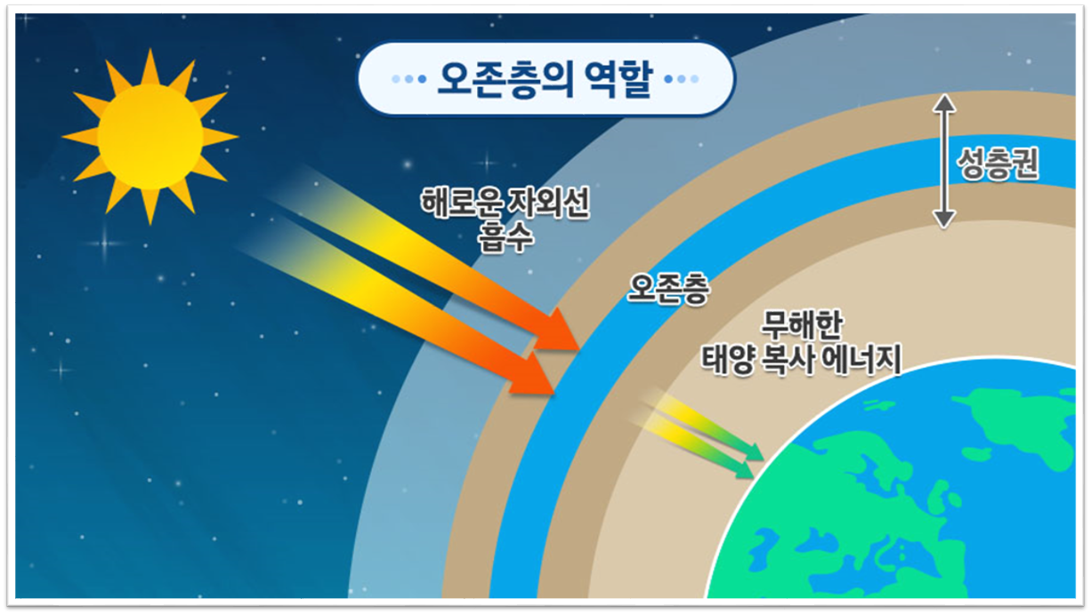 할론소화약제에 포함된 Br, I 원소들이 성층권까지 상승해 오존($O_3$)을 파괴한다. 오존주의보라는 말이 있을 정도로 대기 중에 생성된 오존은 인간의 몸에 해롭다. 활성산소이기 때문에 유기물을 공격해 분해시키는 특성이 있다. 하지만 성층권에 있는 오존은 다르다. 성층권에 위치한 오존들은 엄청난 밀도로 빽빽하게 모여있어 오존층이라 부른다. 오존층은 태양에서 뿜어져 나오는 자외선을 차단해준다. 그 덕분에 우리는 햇빛을 받아도 피부가 멀쩡하다. 오존층이 자외선을 걸러주지 않고 피부에 직접 태양광이 닫게 되면 피부는 순식간에 화상을 입게 된다. 우리에게 잘 알려진 프레온 가스(CFC-11, CFC-12 등)가 오존층을 아주 격렬하게 파괴하는 물질이다. 그래서 프레온가스 또한 현재 사용이 중지되었다. 이와 더불어 프레온가스와 성질이 비슷한 할론소화약제도 국제적으로 사용이 금지되었다. 할론소화약제도 오존층을 파괴하는 성질이 크기 때문이다. 오존층이 없으면 지구상의 생물들은 금방 멸종하고 말 것이고, 이는 인간도 마찬가지일 것이다.