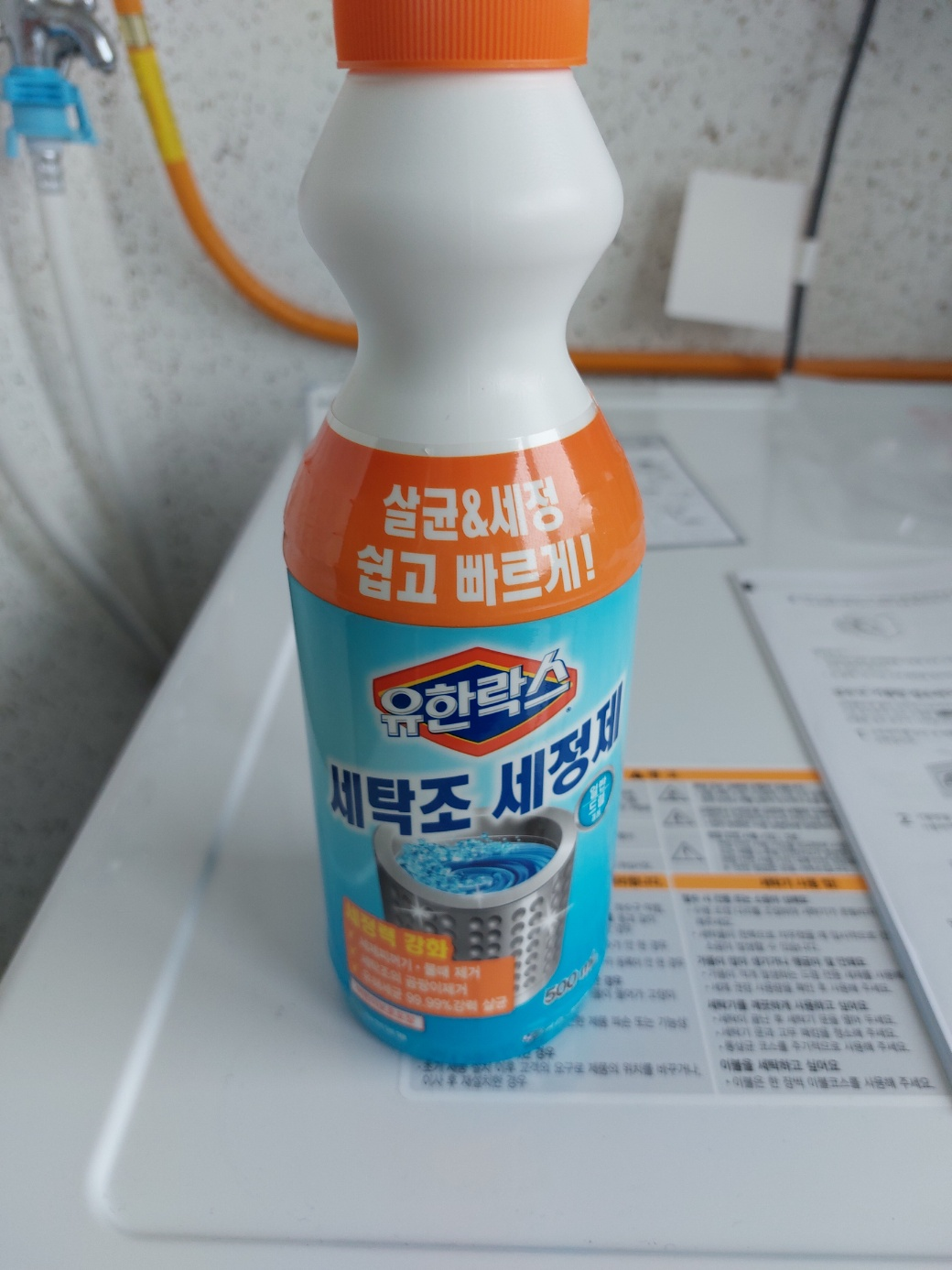 최근에 이사하고 세탁기를 새로 구매하면서 설치기사분께 세탁조 클리너(세정제)를 한달마다 사용하라는 추천을 받았습니다. 그동안 수천번 세탁기를 돌려봤지만, 세탁조 클리너가 있다는 건 처음 알았습니다. 락스로 유명한 유한락스에서 세탁조 클리너를 판매하길래 믿고 구매했습니다. 작은 락스통과 비슷하게 생겼는데, 컬러가 주황색으로 눈에 띕니다.