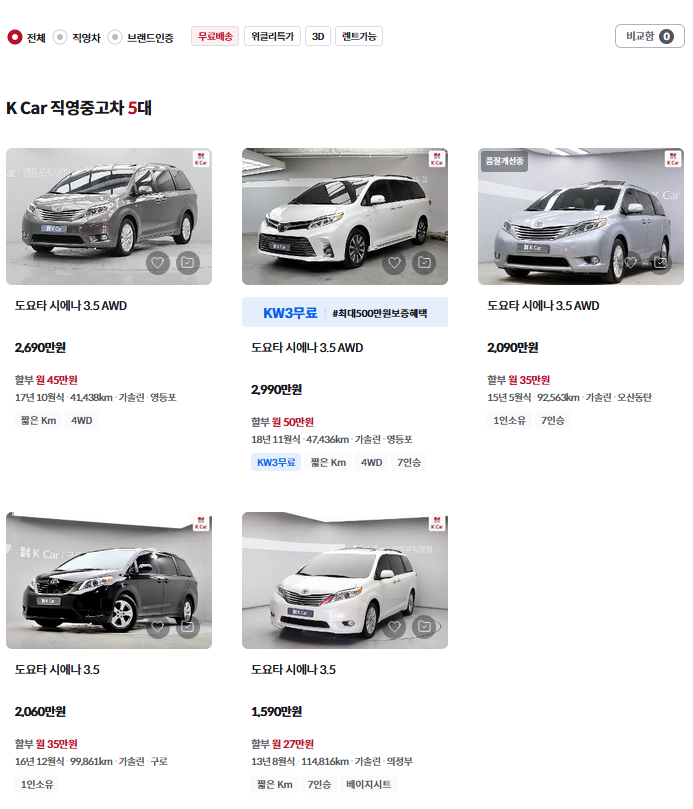 토요타 알파드보다 크기가 더 큰 토요타 시에나는 현재 중고차 매물도 어느정도 있습니다. 개인적으로 토요타 자동차가 잔고장도 적고 디자인도 마음에 들어서 사고 싶은데, 이정도 가격이면 충분히 고려해볼만 하다고 생각합니다.