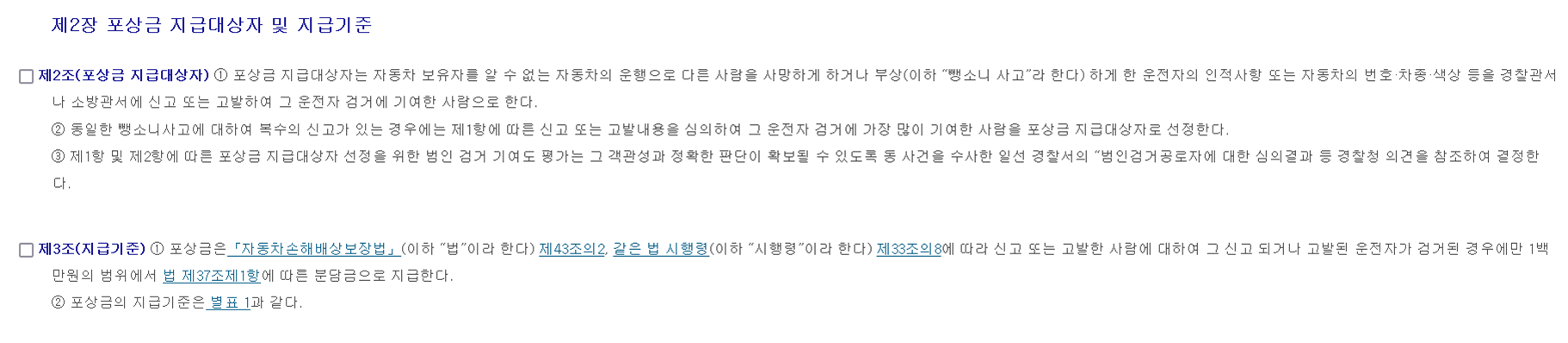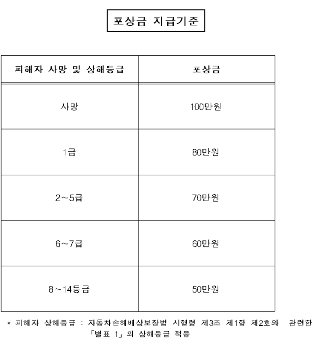 뺑소니사고 신고자에 대한 포상금 지급에 관한 규정에 보면 뺑소니 포상금에 대한 설명이 있다.