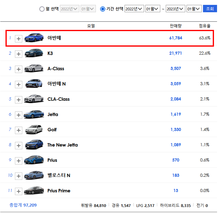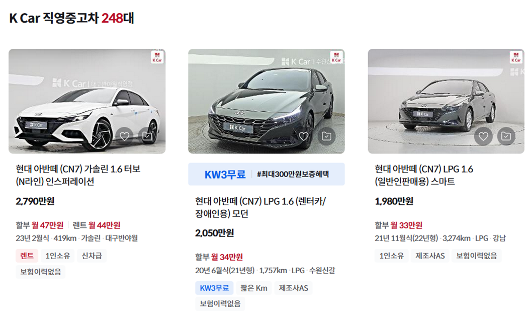 현재 현대 아반떼 7세대는 중고차 매물이 많이 올라와있습니다. 인기가 좋은 만큼 중고차 매물도 많은 것입니다. 국내 준중형 세단 중에서는 아반떼의 판매량이 절대적입니다. 그만큼 디자인도 잘 빠졌고 가격도 저렴한 편이기 때문입니다. 개인적으로 저도 아반떼 7세대가 참 잘나왔다고 생각합니다. 이번에 페이스리프트가 출시되면 중고차 매물 가격은 더 떨어질 것으로 예상합니다. 페이스리프트라는 대체재가 나왔기 때문에 전기형 아반떼 7세대를 찾는 사람이 줄어들 것이기 때문입니다. 수요가 주니 가격이 떨어져야 팔리는 것이죠.