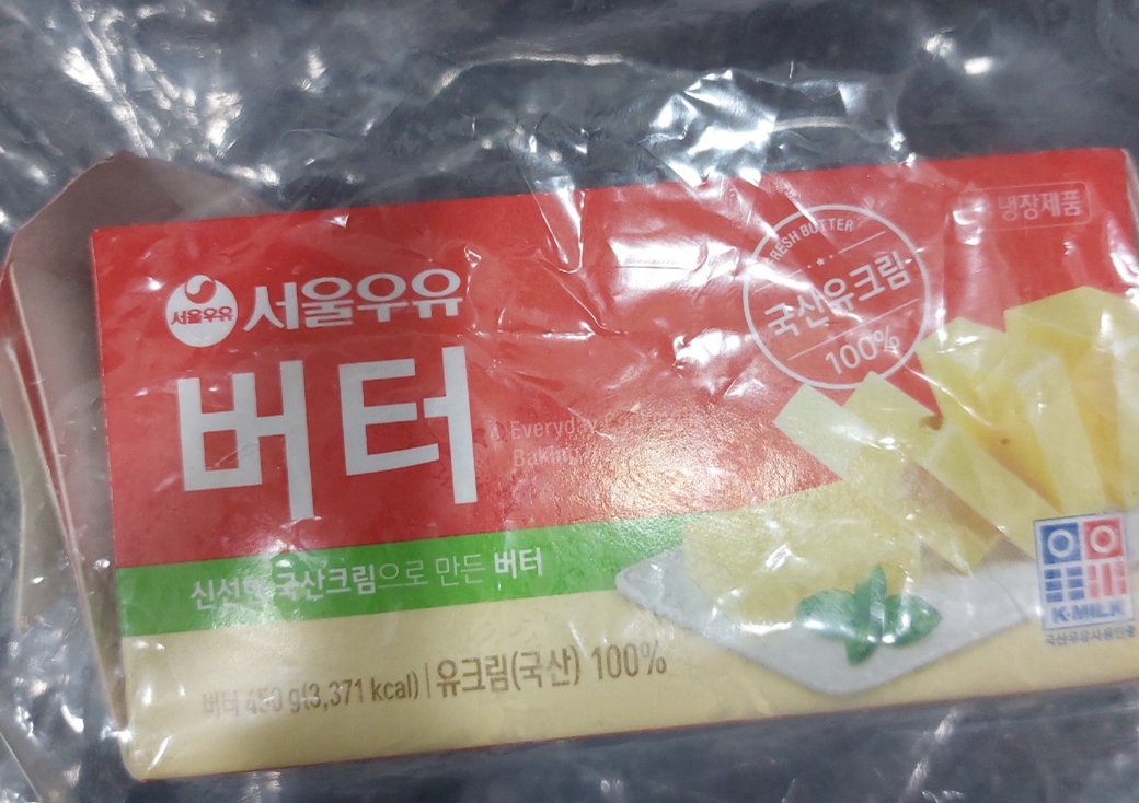 버터는 우유를 원료로 만든다. 우유를 기름성분과 단백질 성분으로 분리하고 이때 분리된 기름성분(지방)이 크림이다. 마트에서 흔히 볼 수 있는 종이팩에 담긴 크림이다. 그 크림을 응고시키면 버터가 되는 것이다. 버터는 생각보다 만드는 과정이 힘들다. 계란 힌자를 손으로 쳐서 머랭만드는 게 힘든것처럼 말이다. 그래서 버터는 생각보다 가격이 비싸다. 450g 서울우유 버터가 8400원이다.