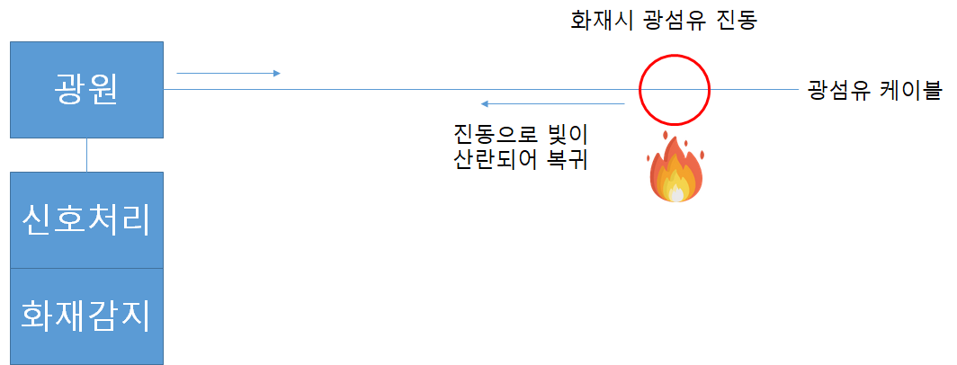 화재가 발생하지 않았다면, 광섬유 케이블 내부를 흐르는 빛은 정상적으로 흐를 것입니다. 하지만 화재 발생으로 광섬유 케이블이 열을 받게 되면 케이블에 진동이 발생합니다. 물체가 뜨거워져 진동을 하는 것이죠. 그러면 케이블 내부에서 반사되며 나아가는 빛은 진동때문에 다른 방향으로 굴절, 산란되게 됩니다. 그러면 평상시에 광원쪽으로 돌아오는 빛의 양이 달라집니다. 이러한 변화량을 감지하고 변화의 정도에 따라 화재의 위치까지도 파악할 수 있는 것입니다. 어느 위치에서 화재가 발생했느냐에 따라 산란되어 돌아오는 광원의 양과 세기가 다를 것이기 때문입니다.