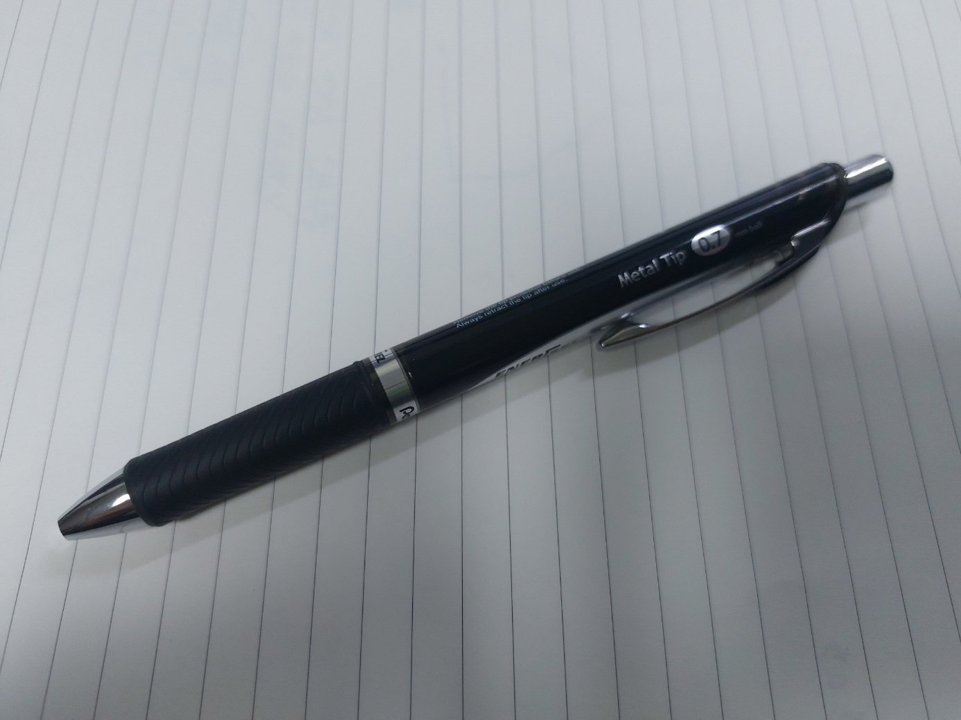 펜텔 에너겔 0.5와 0.7을 비교한 사진이다. 에너겔 0.5는 검은색 바탕에 금색 포인트이고 에너겔 0.7은 검은색 바탕에 은색 포인트이다. 딱 봐도 에너겔 0.7이 굵다. 펜 굵기를 선택하는 건 내 손 힘이 글씨를 쓸 때 어떠하냐에 따라 다르다. 펜텔 에너겔은 힘을 약하게 줘도 필체의 굵기가 굵다. 상대적으로 유니 제트스트림은 얇은 편이다. 그래서 필자는 제트스트림은 1.0을 쓰고, 펜텔 에너겔은 0.5를 쓴다. 제트스트림은 상대적으로 세게 써야 잉크가 굵고 선명하게 나온다.