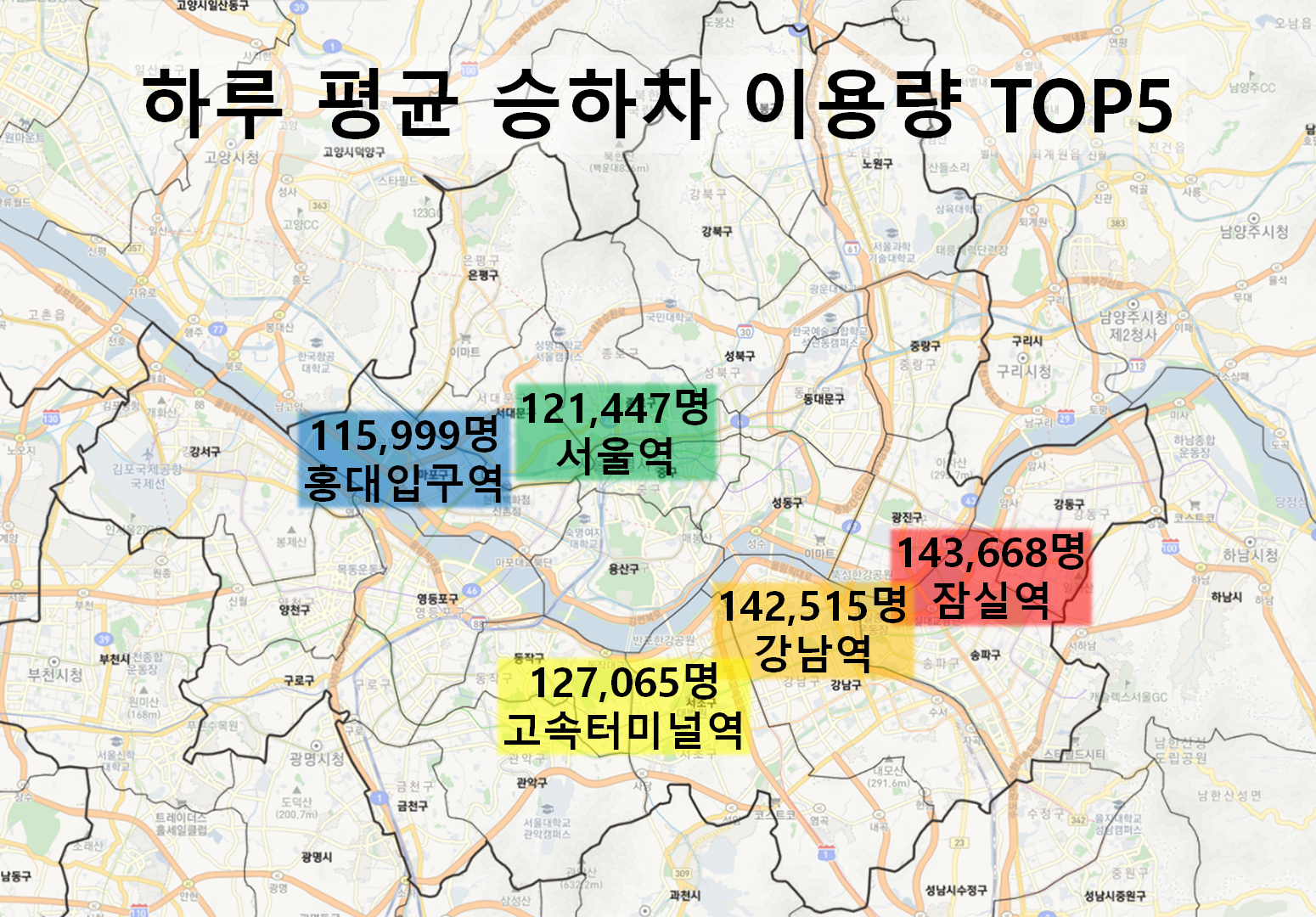 이번 포스팅에서는 서울 지하철에서 가장 많은 사람들이 이용하는 역 Top5를 알아보자.