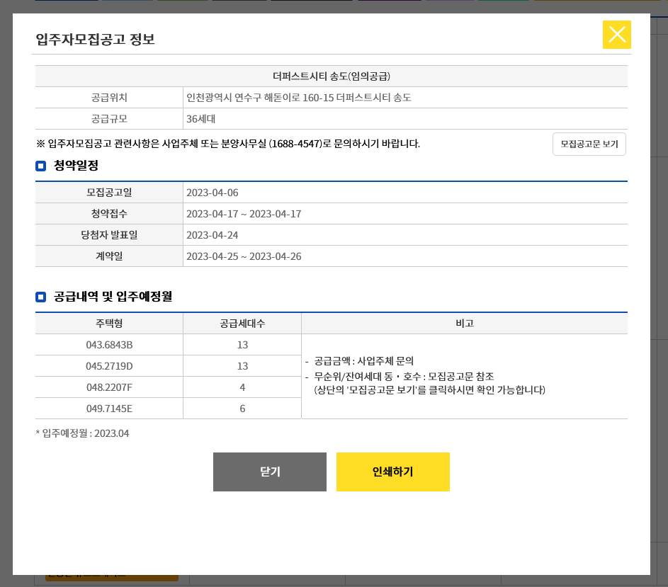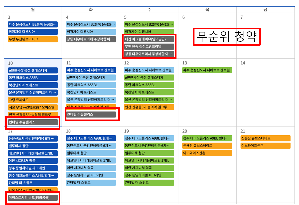 청약홈 홈페이지에서 청약캘린더를 클릭하면 이번달의 청약 일정을 모두 확인할 수 있다. 무순위 청약은 청약캘린더에서 회색으로 표시되어 있다. 회색 아파트를 클릭하면 해당 아파트 분양의 정보가 나온다. 그래서 총 몇 세대의 아파트에서 얼마나 분양을 하는지, 가격은 어떻게 되는지 모집공고문을 통해 확인할 수 있다.