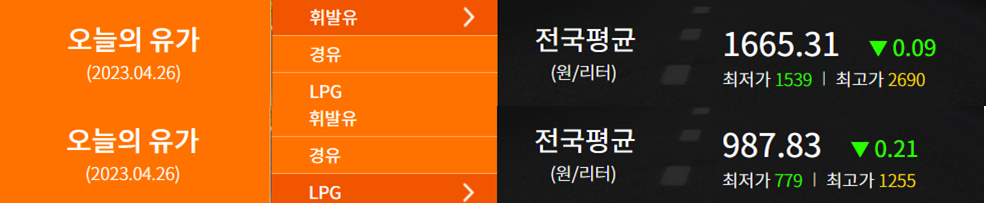 연료가격 기준: 2023.04.26 (출처: 한국석유공사 오피넷)