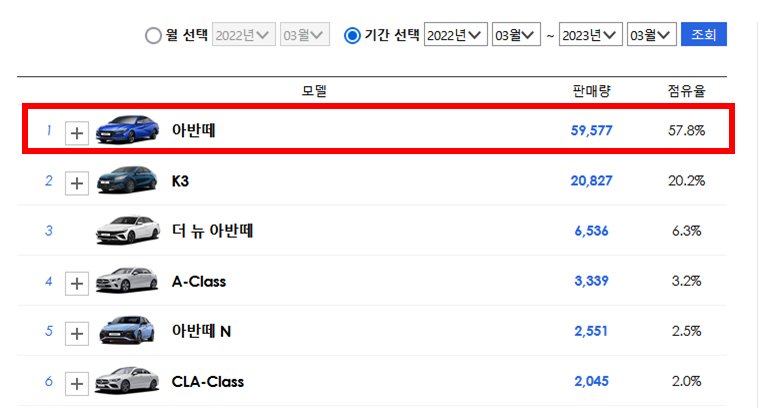 국내에서 준중형 세단의 압도적인 점유율을 자랑하는 현대자동차의 아반떼 페이스리프트 유류비를 알아보겠습니다. 아래 통계를 보시면 아시겠지만, 1년간 판매량 중에서 아반뗴의 판매량은 준중형 세단에서 60%가 넘습니다. 그만큼 현대 아반떼의 상품성, 가성비가 기아 K3보다 좋다는 뜻입니다. 이전에 아반떼와 K3를 비교했었는데, 확실히 기아 K3는 연비부터 시작해서 파워트레인, 디자인까지 현대 아반떼보다 크게 나은 것이 없었습니다.
