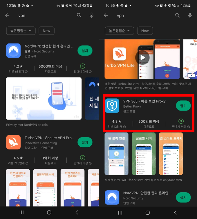 우선 VPN으로 인터넷을 연결하려면 VPN 앱을 다운받아야 합니다. 앱 종류는 크게 상관이 없습니다. 내가 원하는 VPN 앱이 있다면 그걸 다운로드 받으세요. 저는 VPN 365라는 앱을 다운받아서 쓰고 있습니다. VPN 앱에 들어가서 VPN 기능을 작동시키려면 대부분 광고를 보아야 합니다. 물론 5초 정도이지만, 광고 때문에 정신이 뺐겨서 내가 하려던 걸 까먹기도 합니다. VPN 앱은 다운로드 받고 설정 자체의 기능을 이용하면 VPN 앱 광고 없이 VPN 기능을 이용할 수 있습니다.
