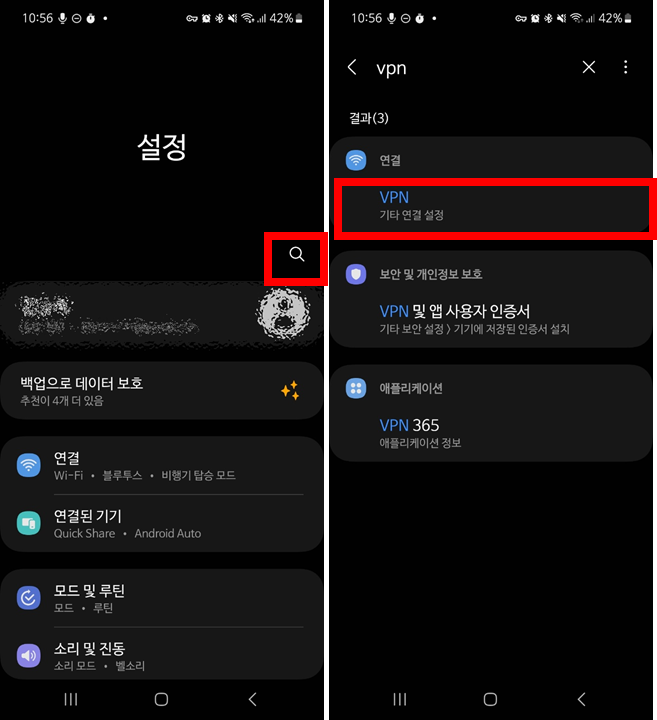 1. 설정앱 - 돋보기 표시 - VPN 입력 - 검색 - VPN 클릭