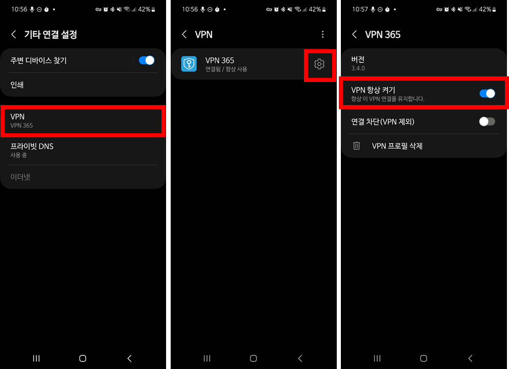 2. VPN (기타 연결 설정) 클릭 - VPN 앱 클릭 - 톱니바퀴 모양 클릭 - VPN 항상 켜기