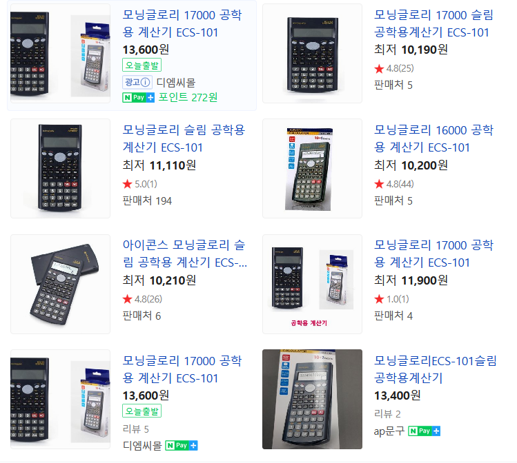 어차피 기능적으로도 모닝글로리 ECS-101 크게 차이도 없다. 차라리 믿고 살 수 있는 카시오 공학용 계산기를 추천한다. 필자도 대학 다닐때 구매했던 3만원 짜리 카시오 공학용 계산기를 5년이 지난 지금도 쓰고 있다. 썡쌩하고 태양광 충전도 되어서 오래 쓰는 데 문제가 없다.