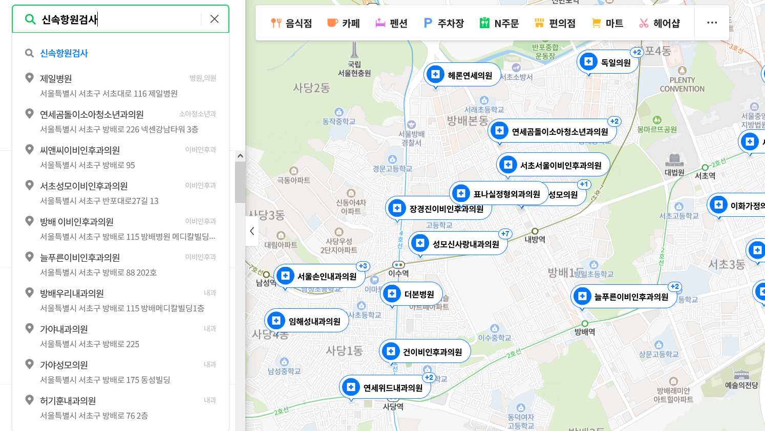 네이버에 신속항원검사라고 검색하면 여러 병원이 나온다. 내가 있는 지역으로 지도를 맞춰서 검색하면 신속항원검사를 받을 수 있는 병원 목록이 나온다. 점심시간 및 병원에 따라 신속항원검사를 실시하지 않을 수 있으므로 꼭 전화를 하고 방문하기를 추천한다.