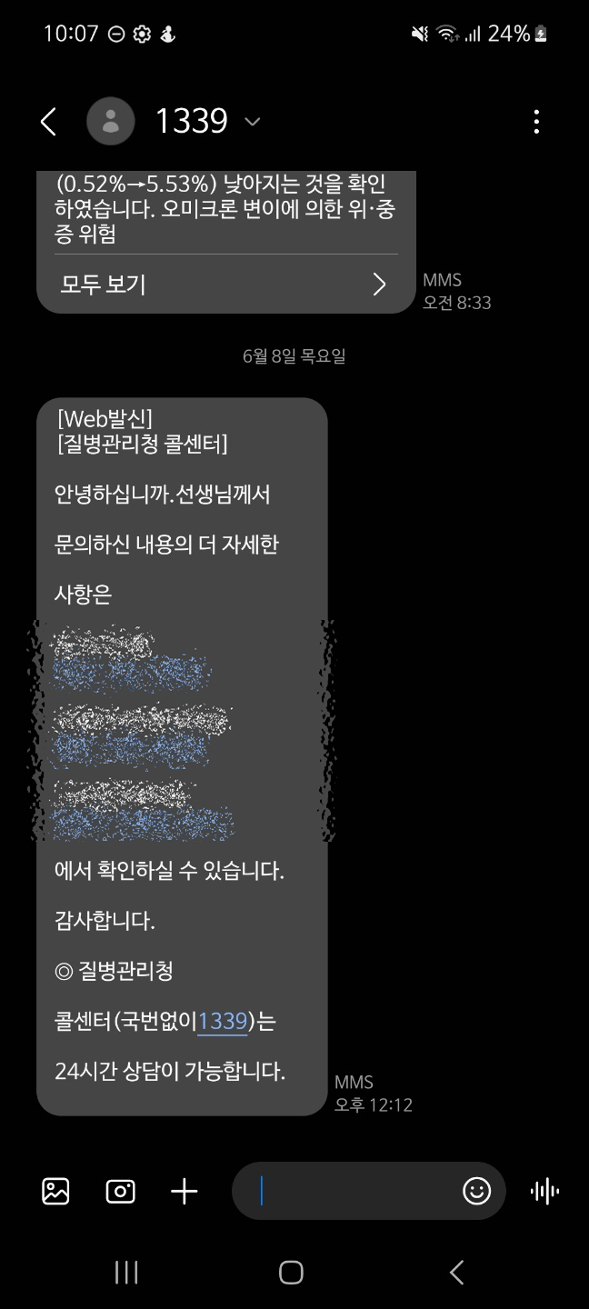 1339에 전화해서 내가 살고 있는 지역을 이야기하면 위와 같이 문자로 신속항원검사가 가능한 병원 목록을 받을 수 있다. (신속항원검사는 자가검사키트와 다를 게 없다)