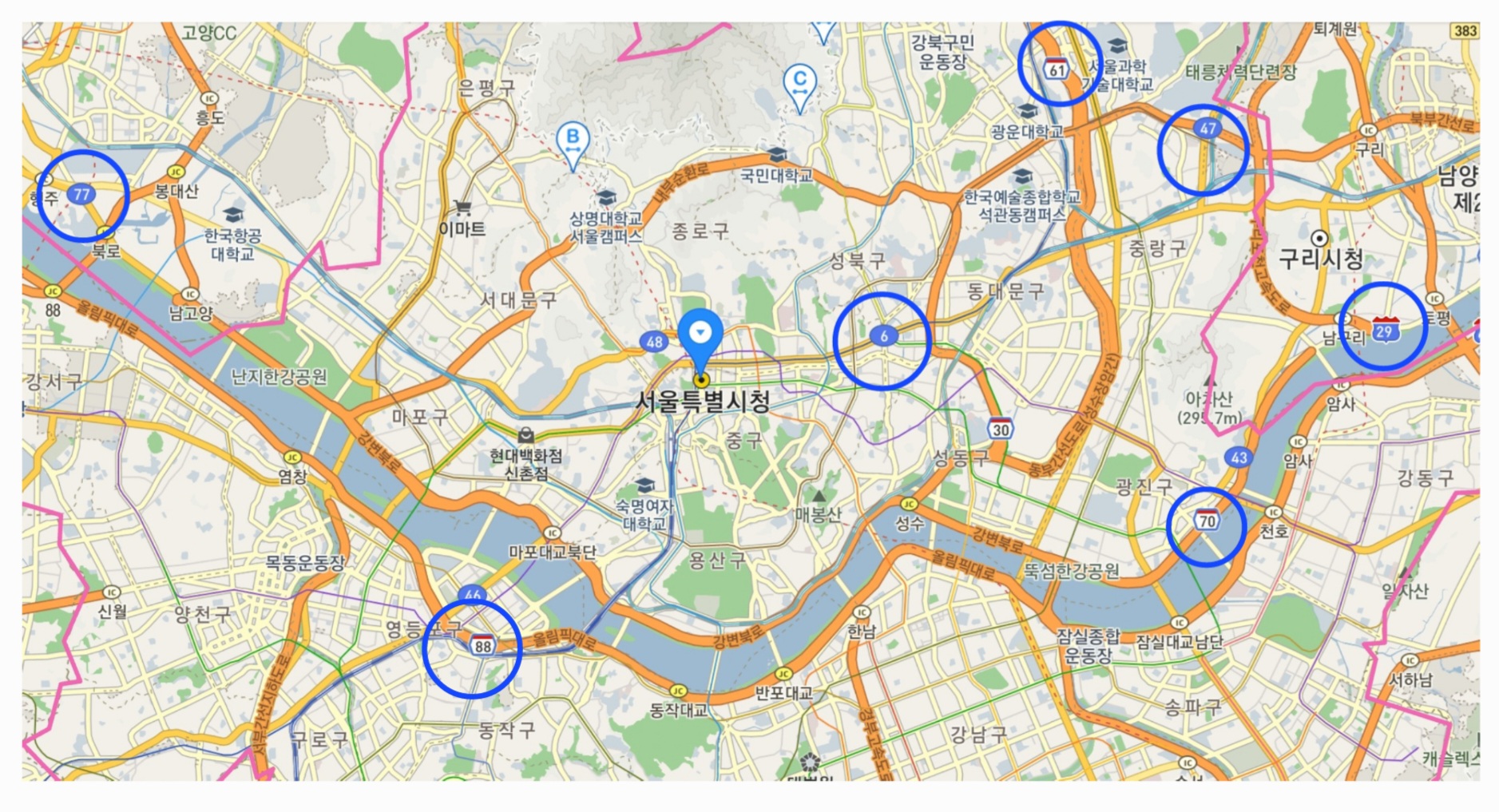 이번에는 한국의 유일한 특별시인 서울특별시 지도를 캡쳐해보았습니다. 청주시와는 다르게 특별시도 표지가 있는 걸 볼 수 있습니다. 축적을 너무 작게해서 지방도 번호는 보이지가 않습니다. 이렇게 도로에 대해 알고보니 내가 주로 다니는 도로가 어떤 도로인지, 도로번호가 어떻게 되는지 알 수 있는 것 같습니다. 배우면 다른 세상이 보인다는 말이 이런데 쓰이는 거 아닐까 싶습니다.