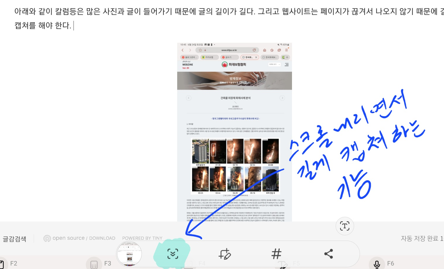 아래와 같이 칼럼등은 많은 사진과 글이 들어가기 때문에 글의 길이가 길다. 그리고 웹사이트는 페이지가 끊겨서 나오지 않기 때문에 길게 캡쳐를 해야 한다. 그런데 페이지가 구분된 노트에 이렇게 긴 사진을 넣게 되면 사진을 크게 확대해야 제대로 볼 수 있다. 매번 크게 확대하는 것도 매우 불편하다. 소방기술사 공부를 위해 기사를 한 두개 봐서는 안되기 때문이다. 그래서 이러한 긴 사진은 페이지 구분이 없는 노트로 저장하는 것이 좋다.