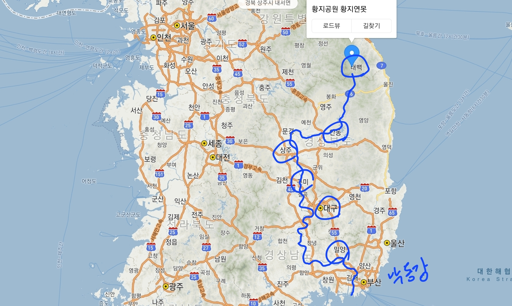 한강다음으로 큰 강인 낙동강도 태백이 발원지입니다. 낙동강은 태백에서 시작하여 경상북도 영주, 본격적으로 물길이 커지며 안동을 거쳐 문경, 상주를 지나 산업단지인 구미, 대구광역시를 지납니다. 이제 경상남도로 내려와서 창녕, 밀양을 지나 서울 다음으로 규모가 큰 도시인 부산에 다다르게 됩니다. 낙동강은 남해와 만나게 됩니다.
