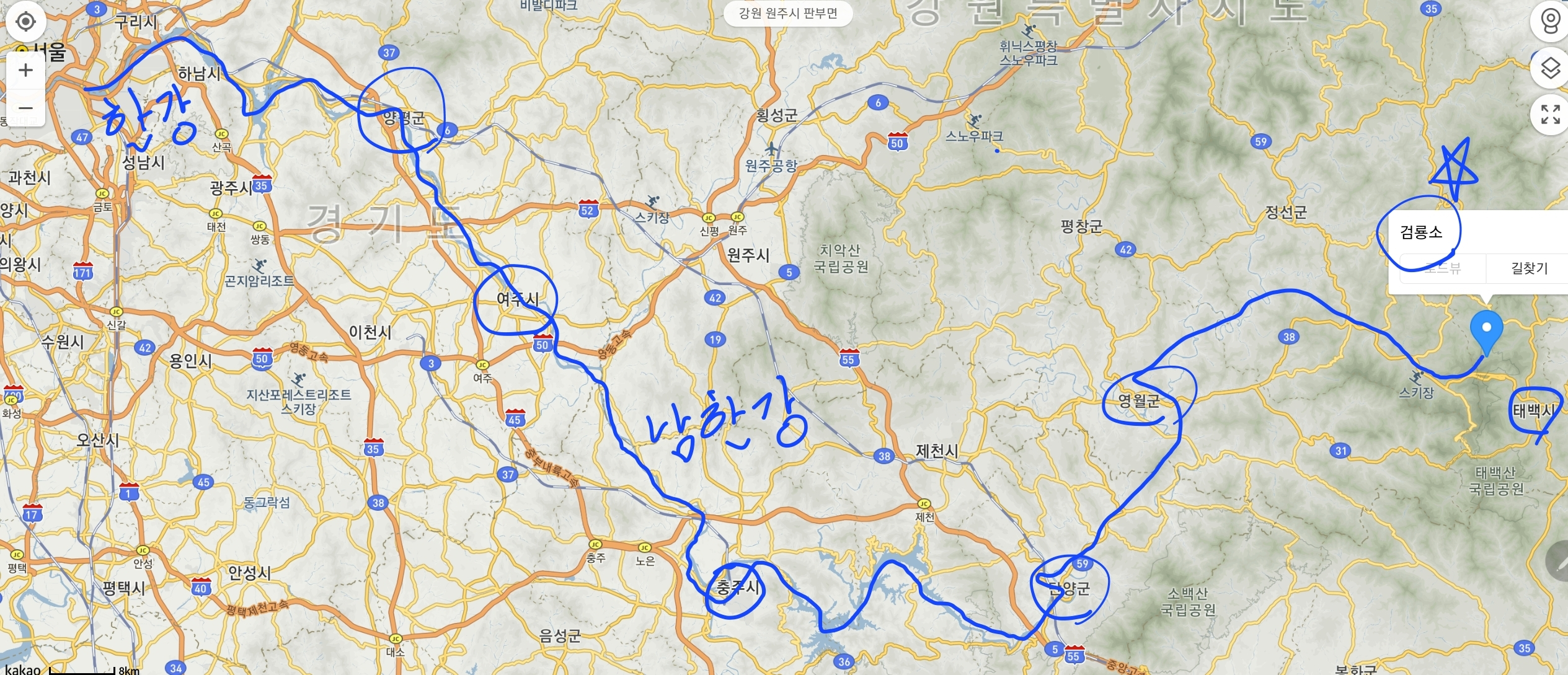 태백 검룡소에서 시작된 물은 태백에서 강원특별자치도 정선, 영월을 거쳐 충청북도 단양까지 내려갑니다. 여기부터 물길이 커지기 시작합니다. 그리고 충북에서 큰 댐 중 하나인 충주댐을 만납니다. 충주에서부터 본격적인 남한강이 시작됩니다. 충주에서 여주를 거쳐 양평의 두물머리(남한강, 북한강이 만나는 지점)에서 북한강과 남한강이 만나게 됩니다. 그리고 한강은 하남, 남양주, 구리를 거쳐 서울의 한가운데를 관통하고 김포, 인천을 지나 서해 바다로 흘러가게 됩니다.