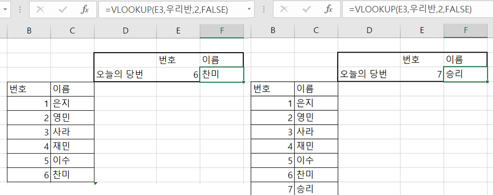 간단하게 vlookup 함수를 이용하면 셀 범위가 들어갈 자리에 '우리반'이라고 입력해도 올바른 값을 나타낸다.