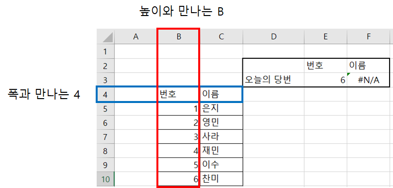 이 경우에는 공식대로 적용해보면 OFFSET(B5,0,0,counta(B:B)-1,counta(4:4))가 된다. 그래서 셀에 입력해보면 엥? 오류가 뜬다. 오류가 뜨는 게 정상이다. 왜냐하면 셀 하나에서는 범위를 표현할 수 없기 때문이다. 이 함수를 그대로 복사해서 이름관리자 기능으로 이동한다. 그리고 주의할 점은 높이에서 1을 빼주어야 한다. 그 이유는 번호, 이름과 같은 구분을 해주는 행이 있기 때문이다. 만약 이런 구분을 해주는 게 열(세로)에 있다면 폭에서 -1을 해주어야 한다.