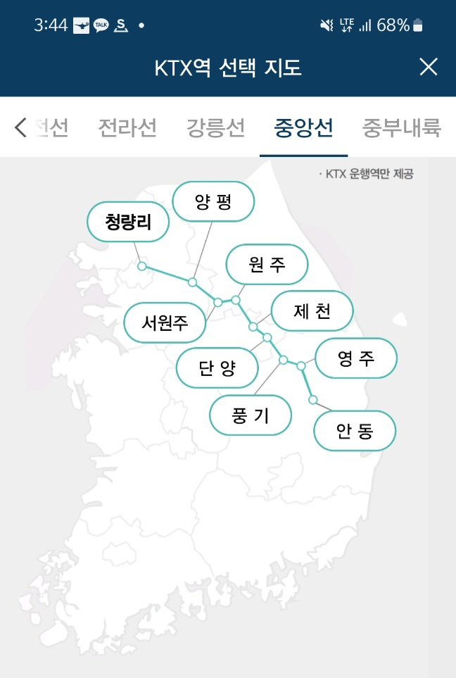 KTX: 청량리 - 양평 - 서원주 - 원주 - 제천 - 단양 - 풍기 - 영주 - 안동