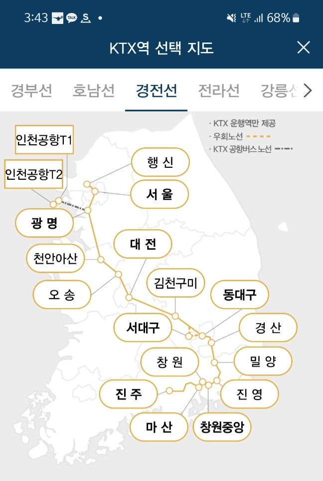 행신 - 서울 - 광명 - 천안아산 - 오송 - 대전 - 김천구미 - 동대구 - 경산 - 밀양 - 진영 - 창원중앙 - 창원 - 마산 - 진주