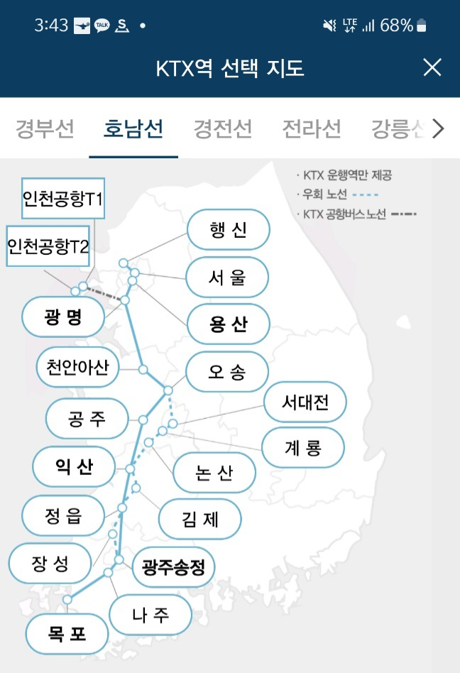 행신 - 서울 - 용산 - 광명 - 천안아산 - 오송 - 공주 - 익산 - 정읍 - 광주송정 - 나주 - 목포