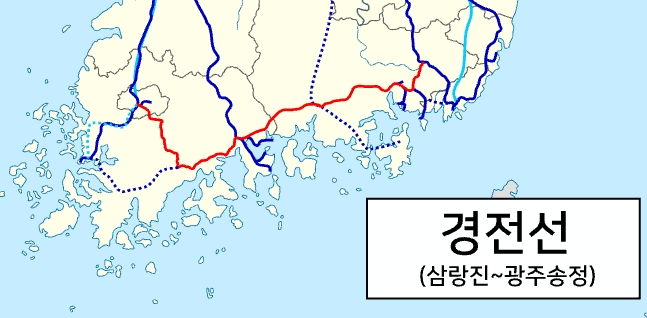 경전선은 사실 아래 그림에 있는 빨간 노선을 뜻한다. 코레일에서 경전선이라 명명한 이유는 전라도-경상도 노선으로만 이용하기에는 경제성이 나오지 않았을 것이기 때문이라 생각한다.