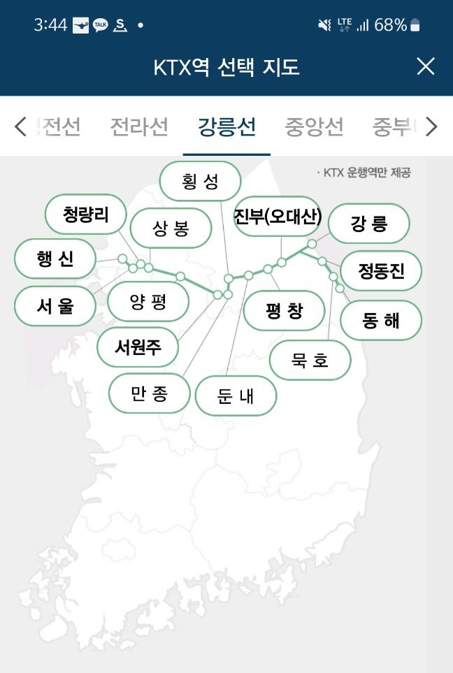 KTX: 행신 - 서울 - 청량리 - 상봉 - 양평 - 서원주 - 만종 - 횡성 - 둔내 - 평창 - 진부(오대산) - 강릉 or - 정동진 - 묵호 - 동해