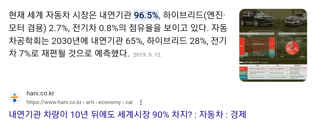 하지만 아직은 휘발유, 경유, LPG를 사용하는 내연기관 자동차의 점유율이 절대적으로 우세하다. 2019년 기준 96.5%가 아직도 내연기관 자동차이다.