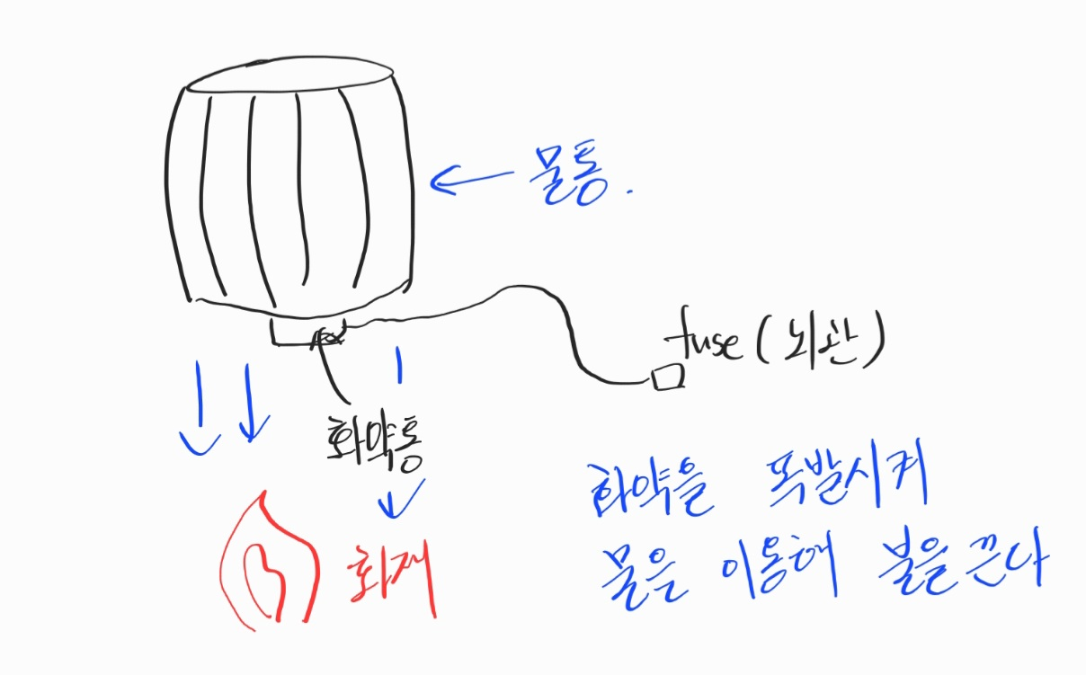 최초의 자동식 스프링클러 17세기 초 앰브로스 고드프리(Ambrose Godfrey)라는 화학자가 최초로 상품화를 하였습니다. 화약통에 화염으로 점화되는 퓨즈와 연결되어있고 화약이 점화되면 물통이 파괴되면서 물이 방출되는 단순한 구조였습니다. 지금 보면 너무나 단순해 보이는 장치이지만, 그때는 높은 위치에 있는 물을 이용해 소화를 하는 획기적인 방식이었습니다. (물론 수동으로 작동시켜야 하는 한계가 있음)