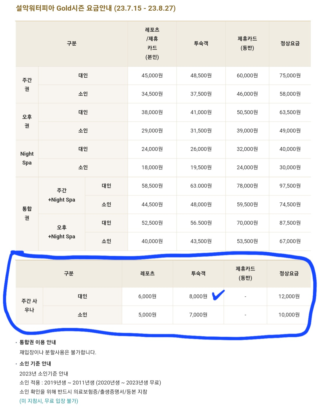 2. 한화리조트 주간 사우나 이용금액: 앱 회원가입시 무료, 기본 12,000원, 투숙객 8,000원
