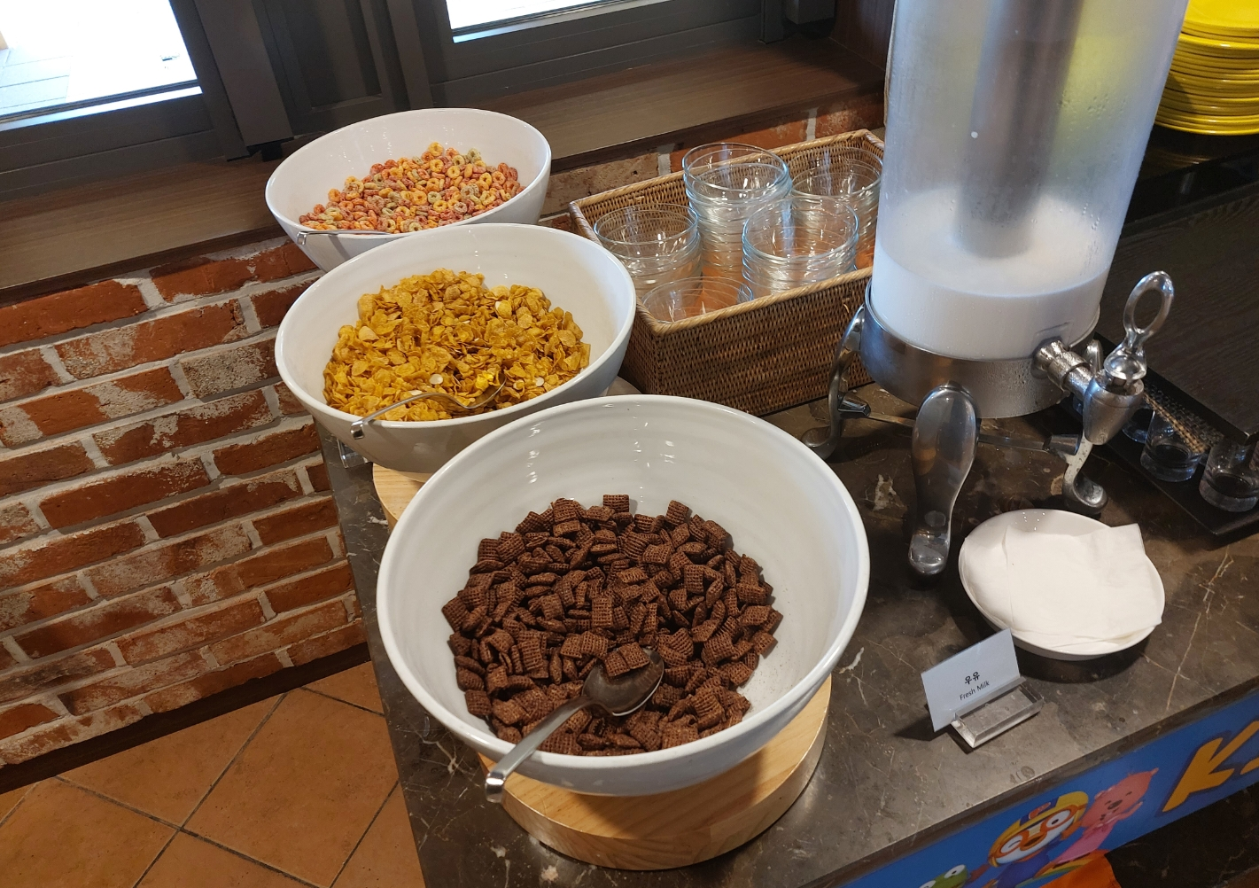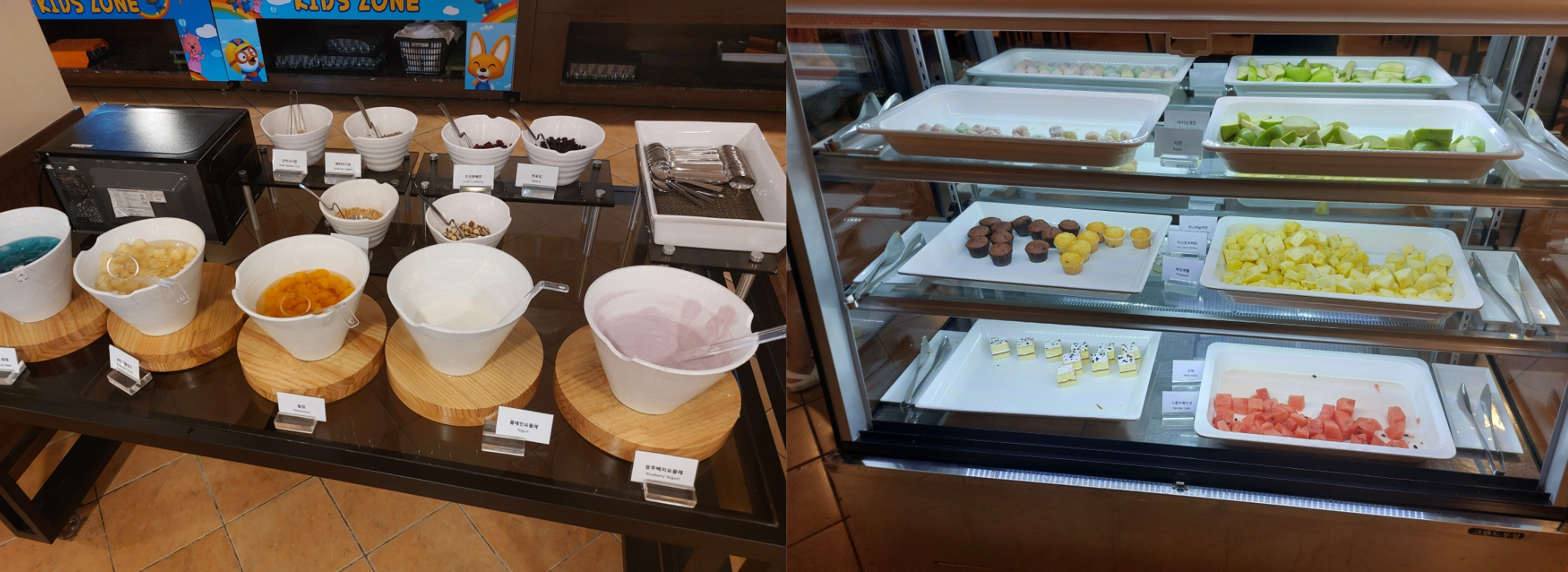 그리고 마지막으로 여러 후식들이 있습니다. 요거트, 케이크, 과일, 시리얼 등 아이들이 좋아하는 후식도 많이 있습니다. 저도 많이 먹지는 않았지만 간단하게 먹었네요.