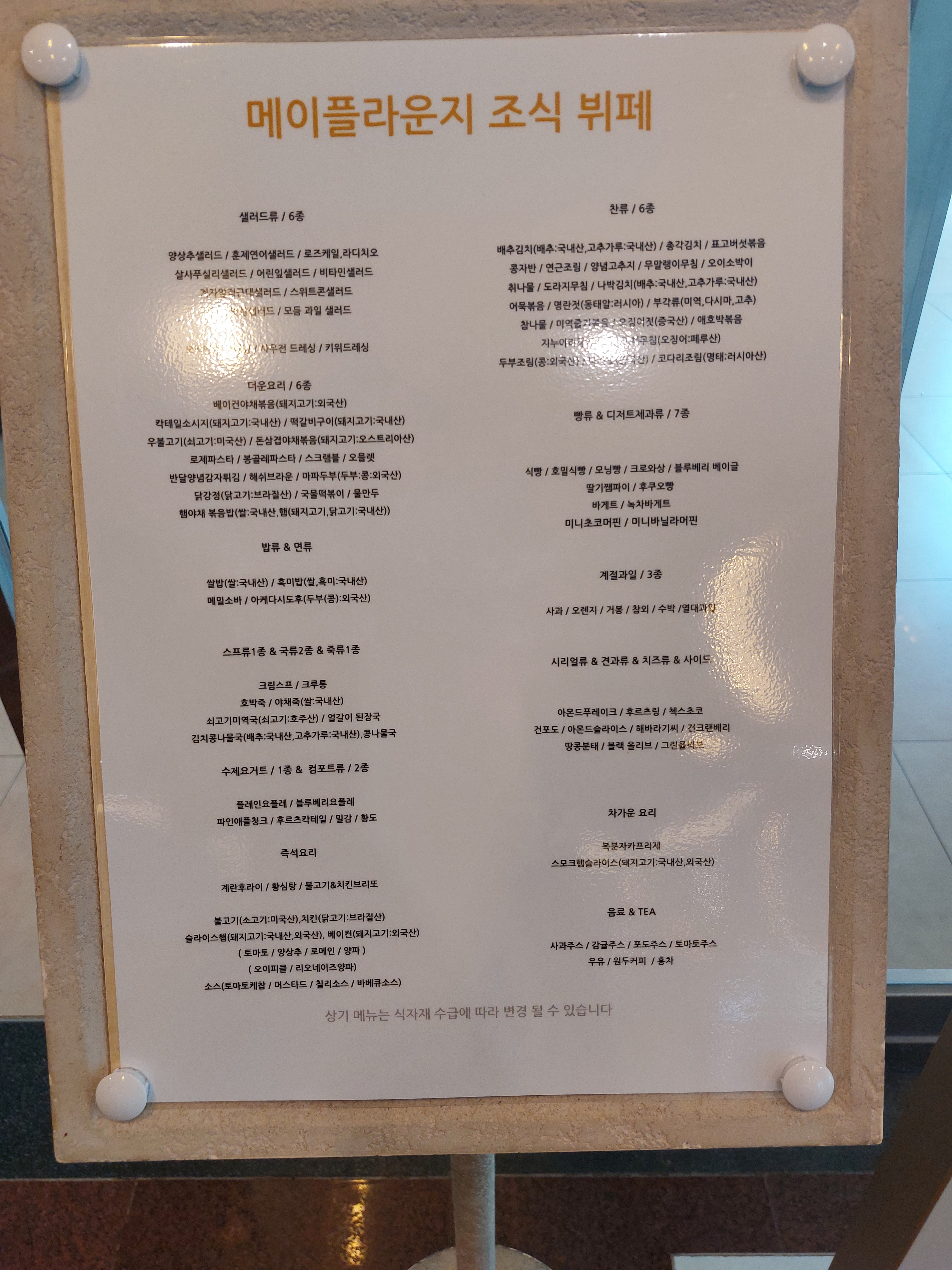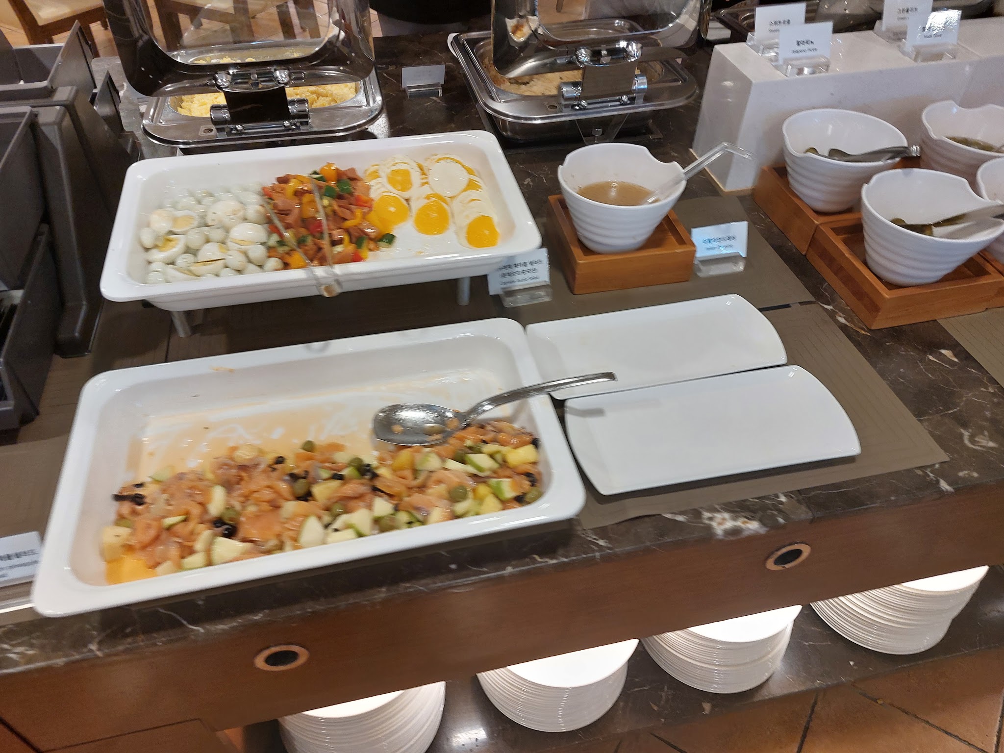 메인디쉬는 8종류가 있습니다. 베이컨, 소세지, 닭강정 등 고기류가 대부분이었습니다. 훈제 연어가 있어서 아주 많이 먹었습니다. 훈제 연어 위에 북경식 오리고기?라는 게 있었는데 차가워서 저는 별로였습니다.