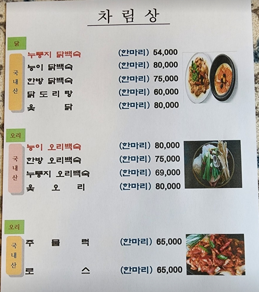 용인 고기동 장수촌은 백숙을 중심으로 메뉴가 구성되어 있습니다. 크게 오리백숙, 닭백숙으로 나뉩니다. 저는 개인적으로 오리 백숙을 더 좋아합니다. 고기가 부드럽고 더 고소합니다. 그만큼 오리백숙이 좀 더 비쌉니다. 저는 지난번 속초 휴가를 제대로 못 즐겨서 맛있는 거라도 먹자라는 생각으로 좀 더 비싼 오리백숙을 시켰습니다.
