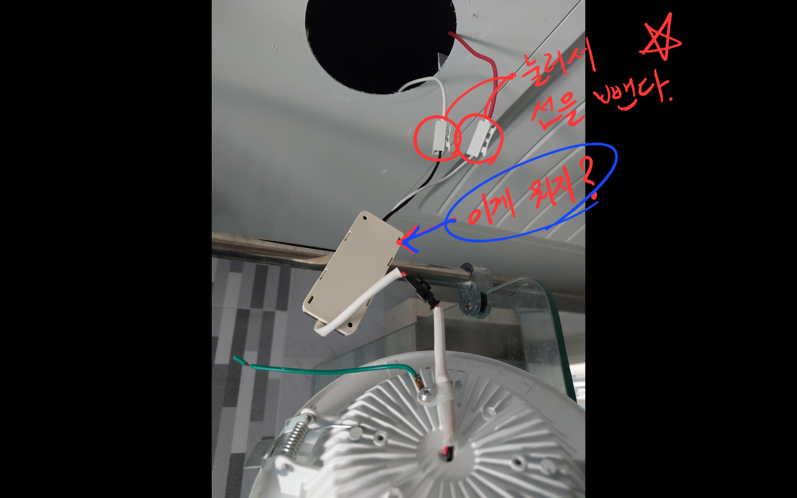근데 좀 화나는 게, 이번에 산 LED 등은 변압기가 안에 내장되어 있는데, 이거는 외부 변압기가 있는 걸 보니 더럽게 싼 제품 썼나보다. (아니.....집주인님아...) 내가 볼땐 컨버터(변압기)에 습기차서 그런거 같다. 아니 욕실등은 컨버터 내장형을 써줘야지 뭐하는거냐.(이렇게 만든 제조사도 문제)
