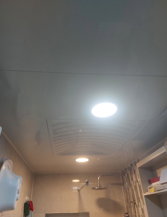 2. 전기를 차단했으면 이제 욕실 천장에 있는 전등을 빼준다. 이런 원형 LED 등은 반자의 얇은 두께에 스프링으로 고정하기 때문에 그냥 당기면 되는데, 반드시 스프링 없는 부분을 잡고 당겨야 한다. (스프링 펴지면서 손가락 맞으면 멍든다..)