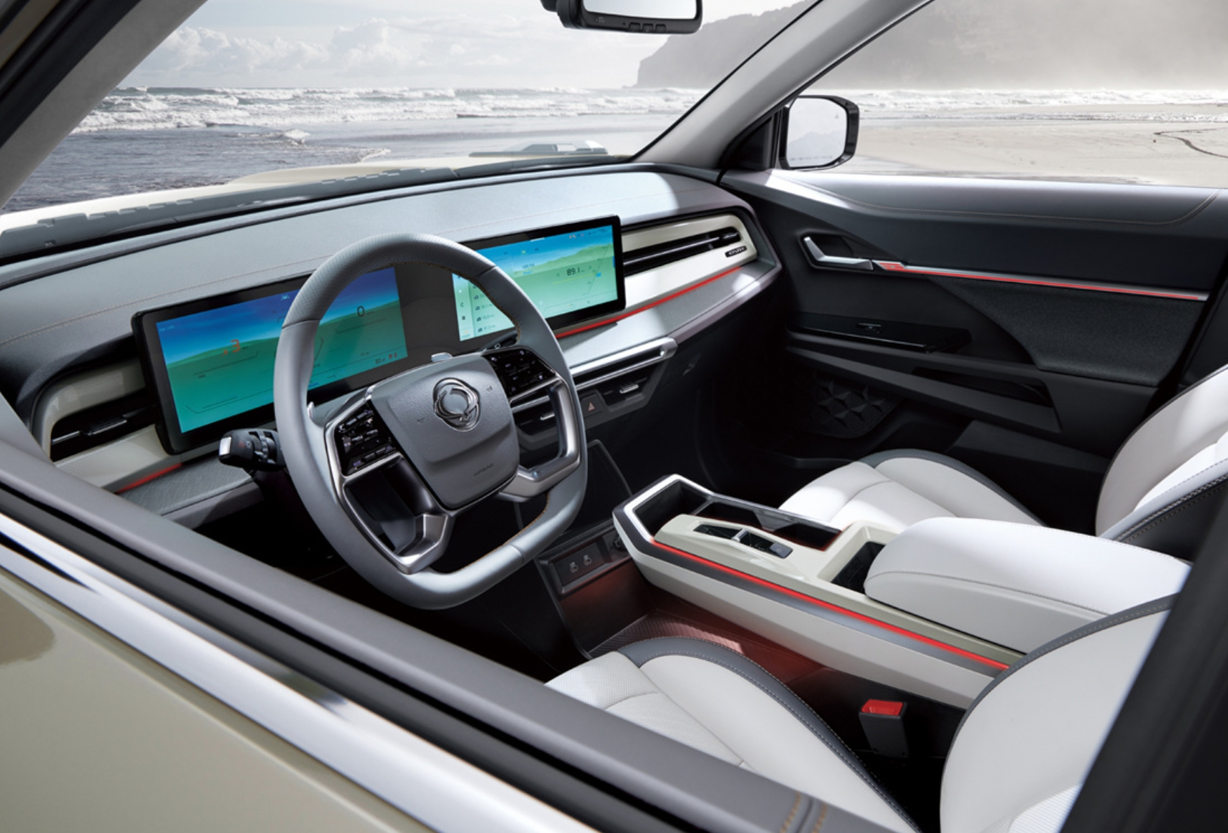 토레스 EVX 실내는 요즘 트렌드에 맞춰 계기판, 조작판 디스플레이가 모두 적용되었습니다. 다만 아쉬운 건 일체형이 아닌 분리된 디스플레이라는 것입니다. 그래도 KG 모빌리티에서 현대, 기아를 따라가려는 노력이 많이 보입니다. 그리고 요즘 실내 트렌드에 맞춰 깔끔하면서도 레드 라인으로 포인트를 강조한 것이 특징입니다. 중형 SUV 전기차 중에서는 가장 SUV 다운 디자인을 하면서도 실내는 최신 디자인을 갖춘 게 아주 마음에 듭니다.
