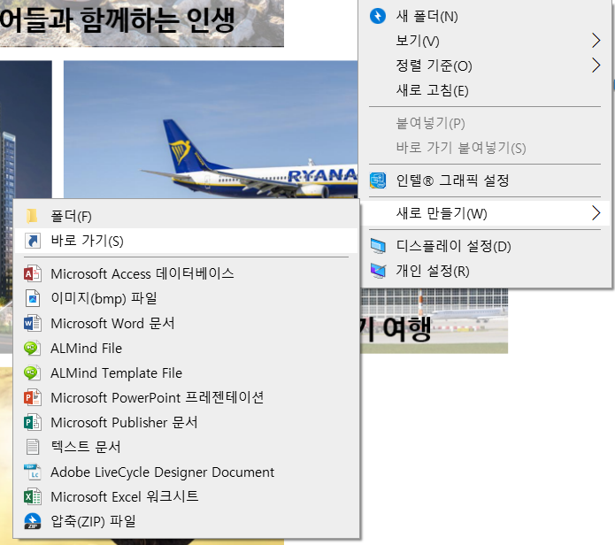 첫째, 바탕화면에서 우측 마우스를 클릭하여 새로만들기 - 바로가기를 클릭한다