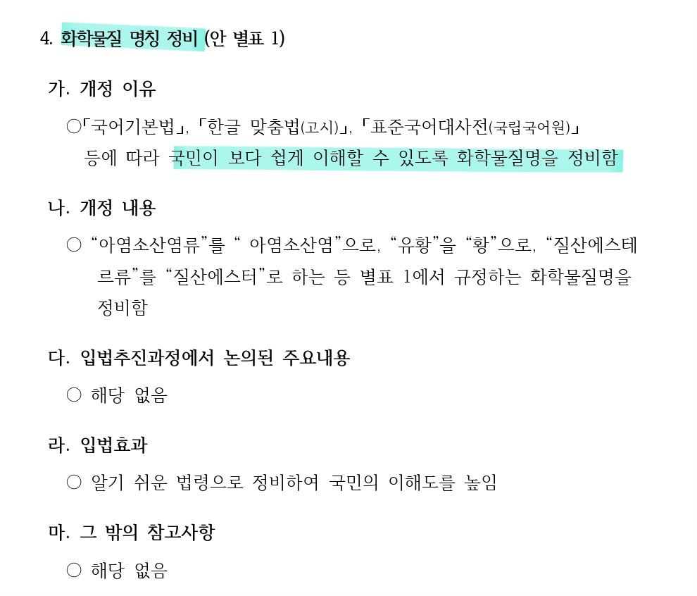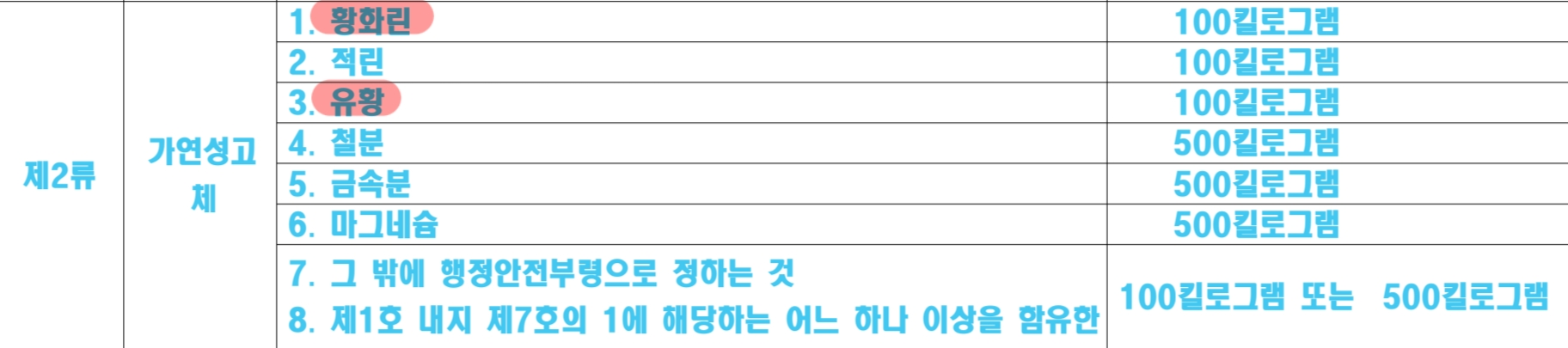 각 개별 물질의 위험성을 평가하여 지정수량을 정하는 방식이 된 것 같습니다. 기존에는 200kg의 지정수량으로 위험물안전관리법의 영향을 받던 물질이 이번 개정으로 지정수량 제한이 없는 물질이 될 수 있는 것이죠.