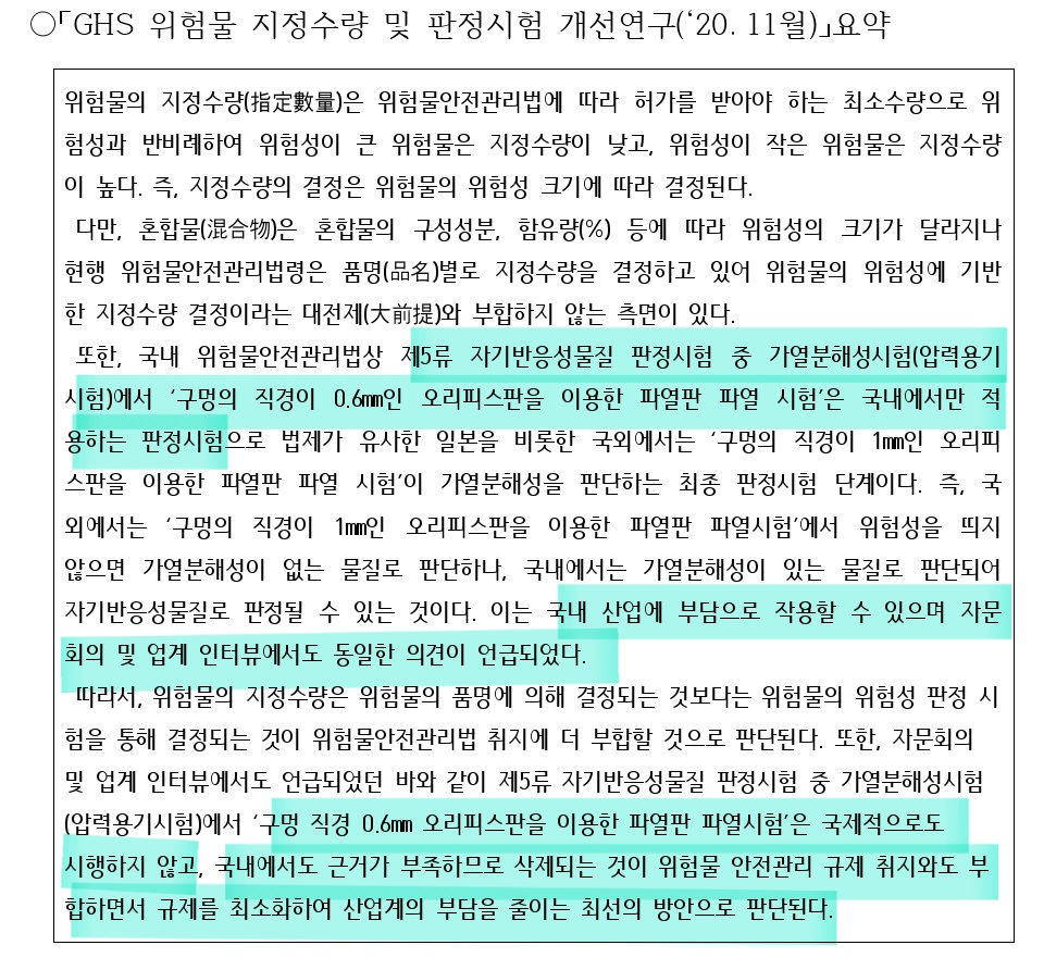 그리고 가장 중요한 지정수량이 1종 10kg, 2종 100kg으로 변경되었습니다. 지정수량이 왜 바뀌었는지는 아래 GHS 관련 연구 요약문에 정리되어 있습니다.