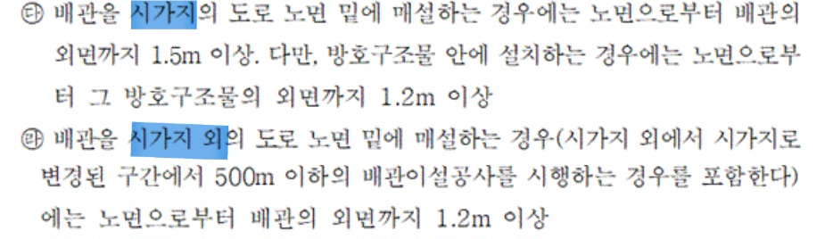 도시가스사업법에 의하면 가스배관의 심도는 시가지인 경우와 아닌 경우에 따라 달라진다. 근데 문제는 시가지가 과연 어떤 곳이냐에 대한 기준이 도시가스사업법에 나와있지 않다.