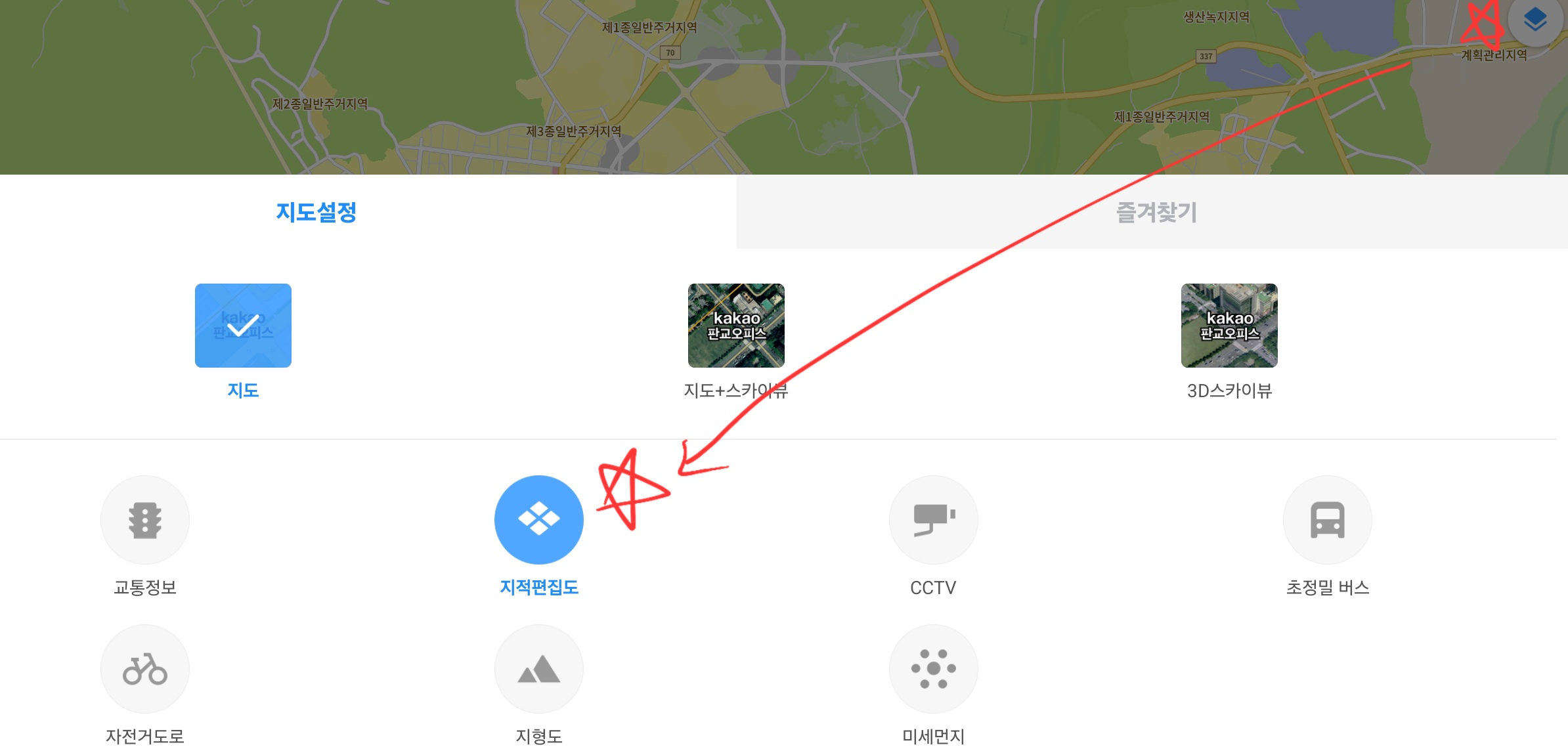 1) 카카오맵에 들어가서 우측 상단에 마름모 모양 표시를 누른다. 그리고 지적편집도를 클릭한다.