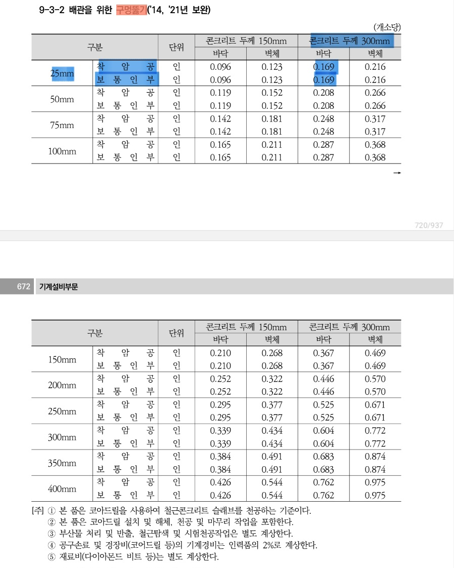 3. 품셈을 보고, '시공사에서 300mm 콘크리트 바닥으로 25mm 천공할때 품셈을 적용했구나!' 를 알 수 있다.