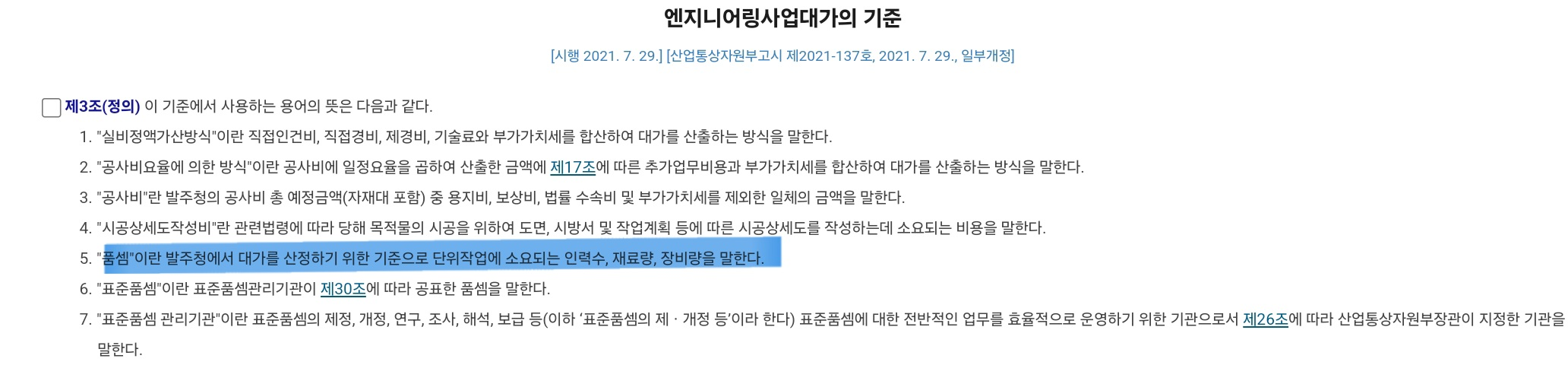 품셈: 발주청에서 대가를 산정하기 위한 기준으로 단위작업에 소요되는 인력수, 재료량, 장비량을 말한다